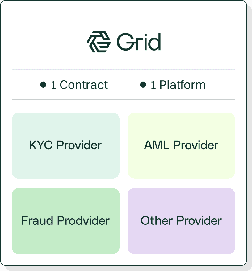 Unlike point solutions that require separate contracts for each data provider, Grid consolidates KYC, AML, fraud prevention, risk decisioning, and identity verification into one orchestrated workflow: one contract, one integration, infinite flexibility.